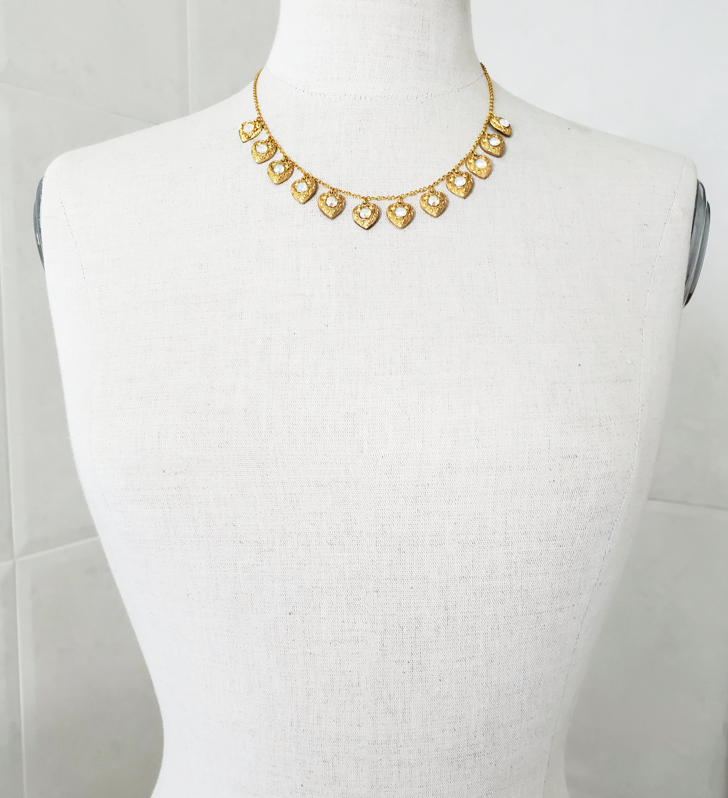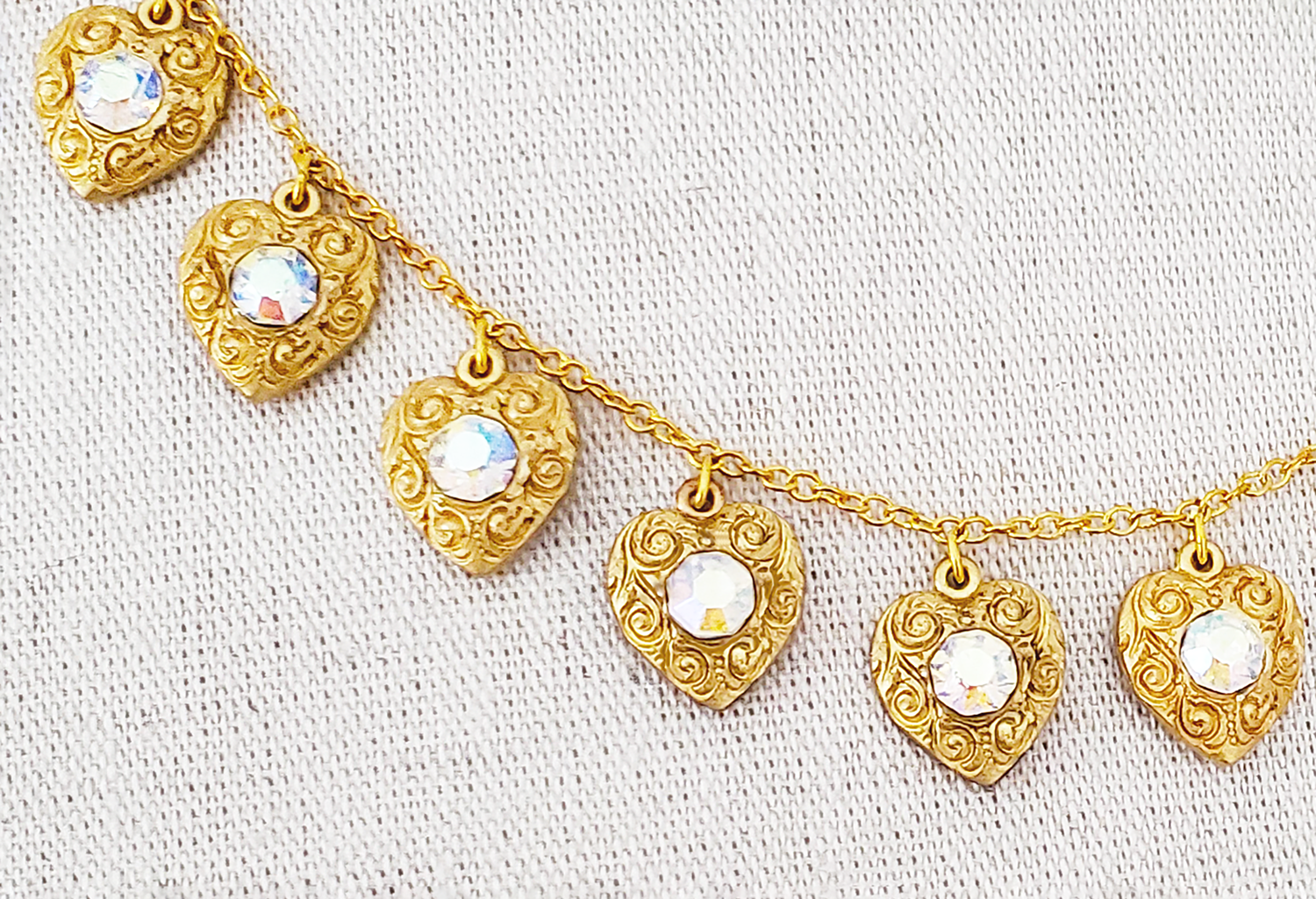 These are deeply struck, solid brass stampings and quite substantial. The table-cut rhinestones are different than machine cut rhinestones (like Swarovski). In table cut stones, the facets are not sharp, which makes them look more round and glowing, and they stand out in the well defined, die-cut design of the hearts.