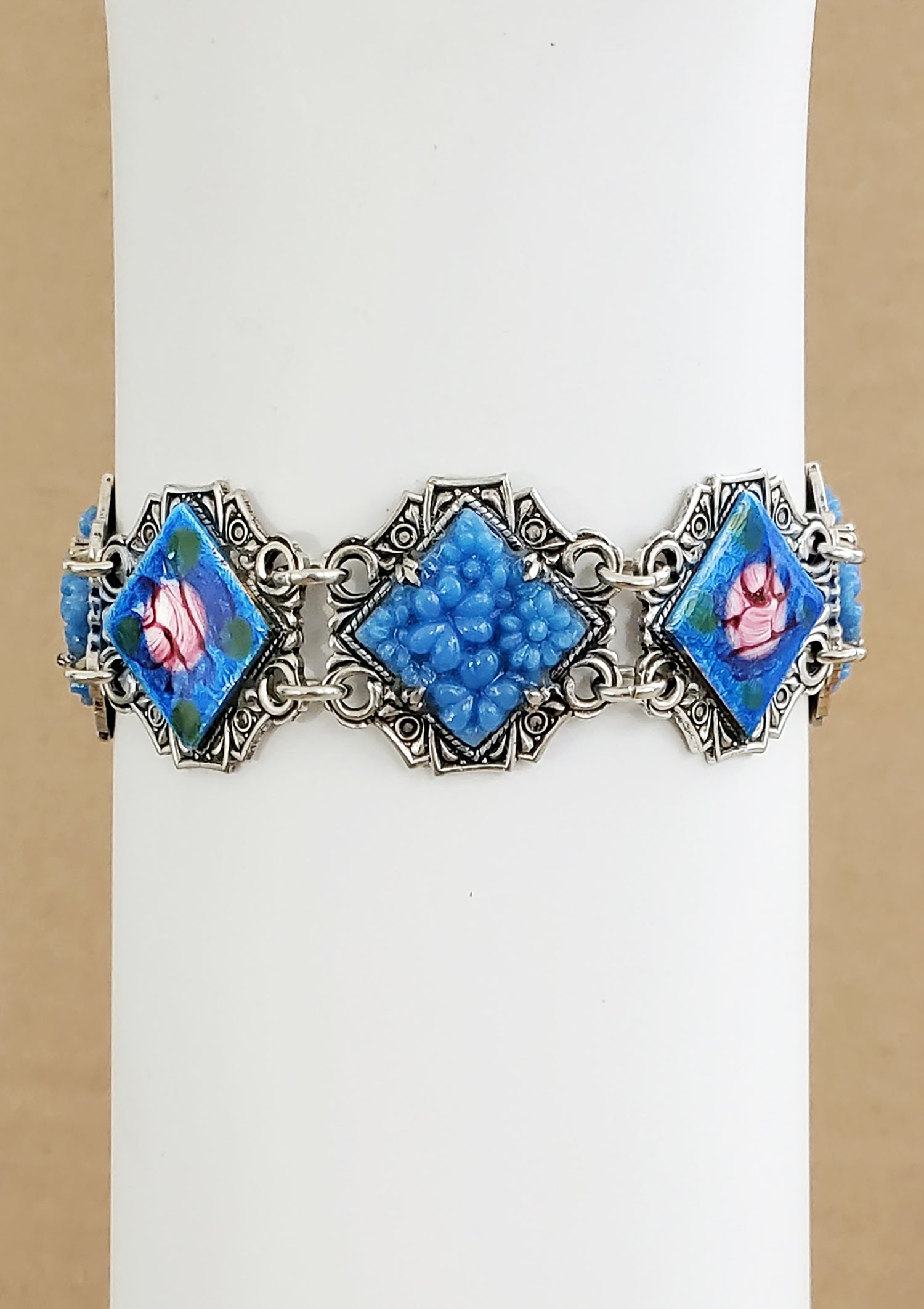 A serendipitous combination of molded vintage glass and vintage guilloche enamel, kicking it old school in ornate settings that have been made in the same machine tools for over 100 years. They belong together.