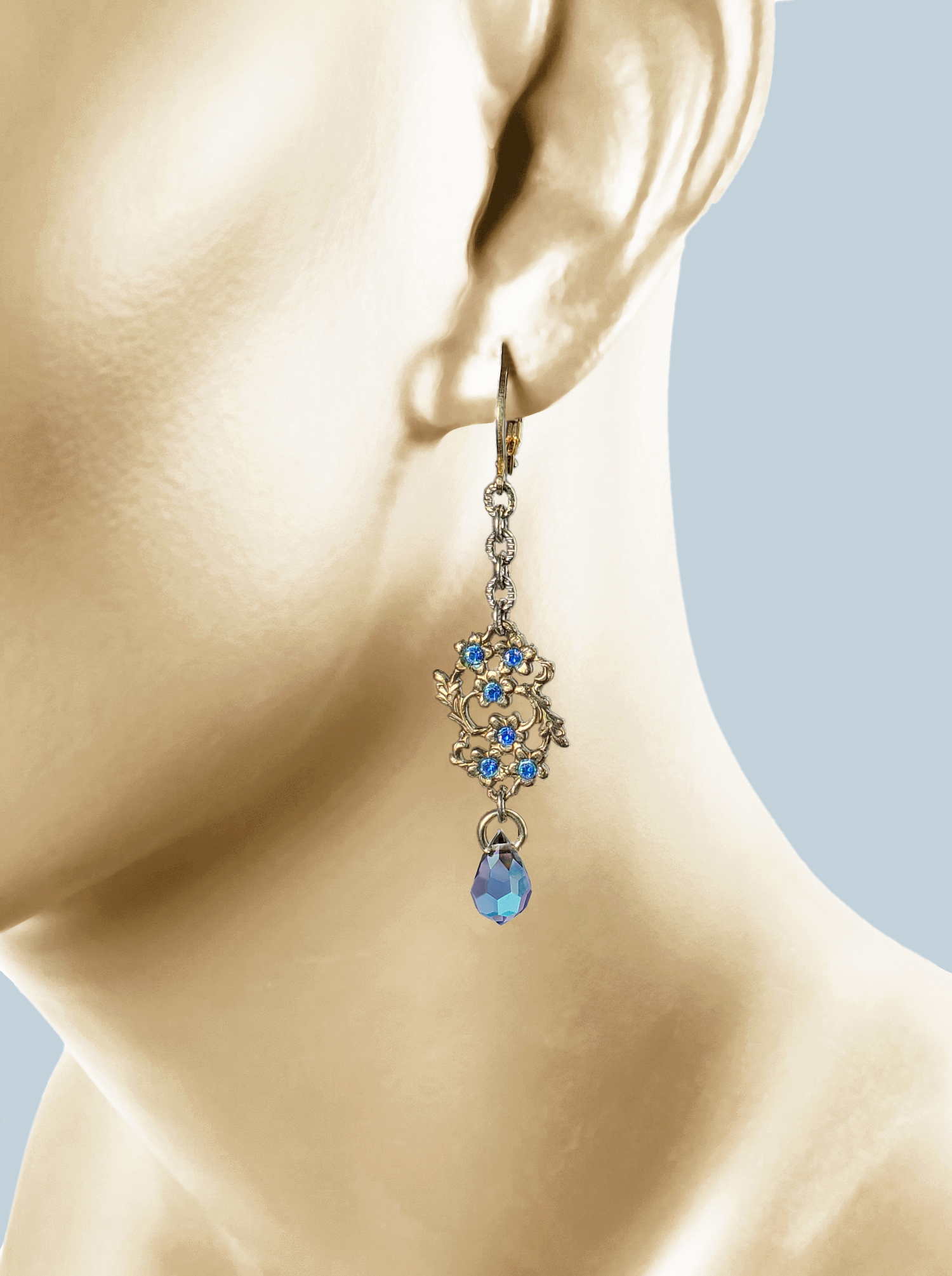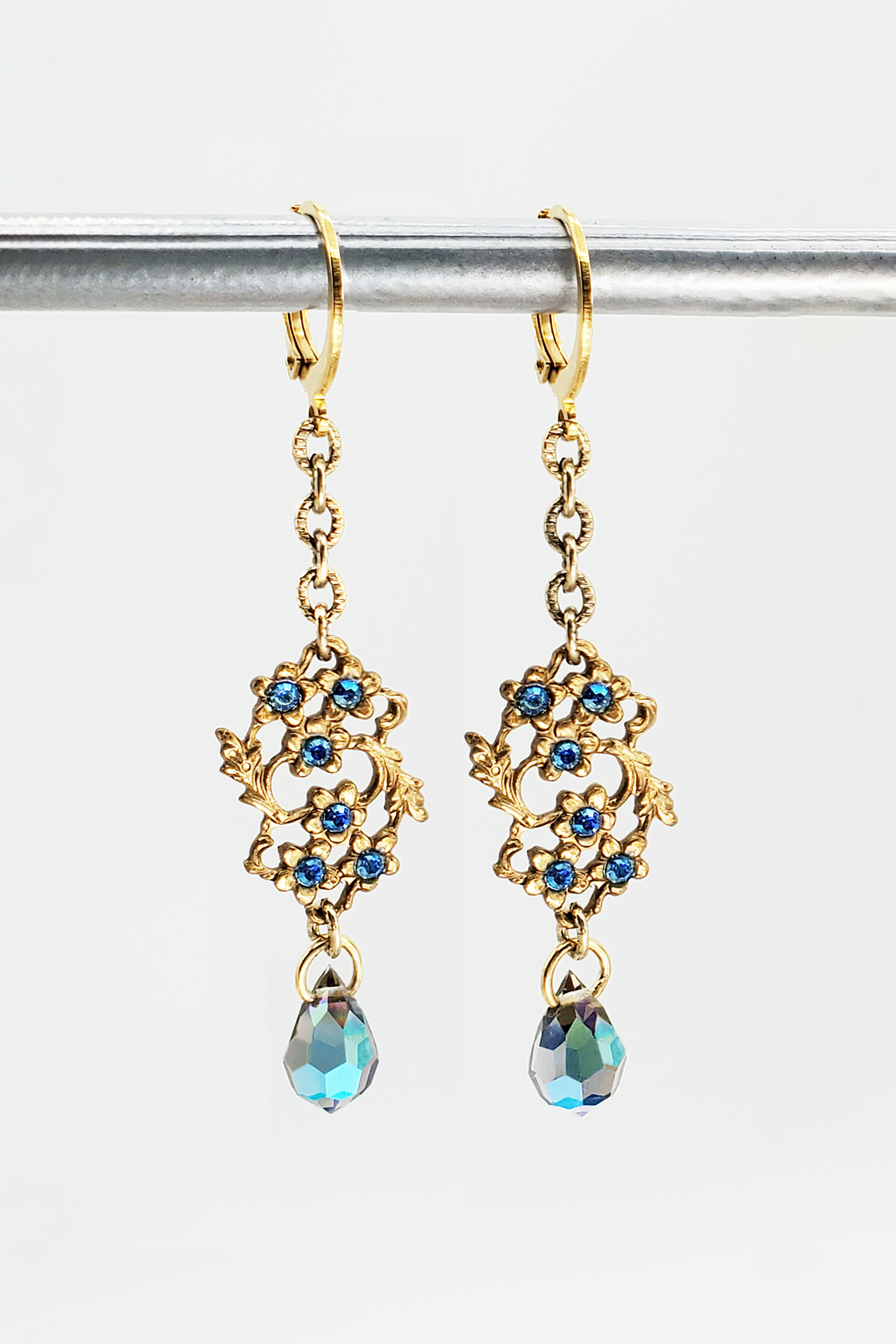 The cutwork vintage stamping looks like lace, dotted with blue star flowers. An Aurora crystal drop picks up a spectrum of blue and purple. Rhapsody in blue.