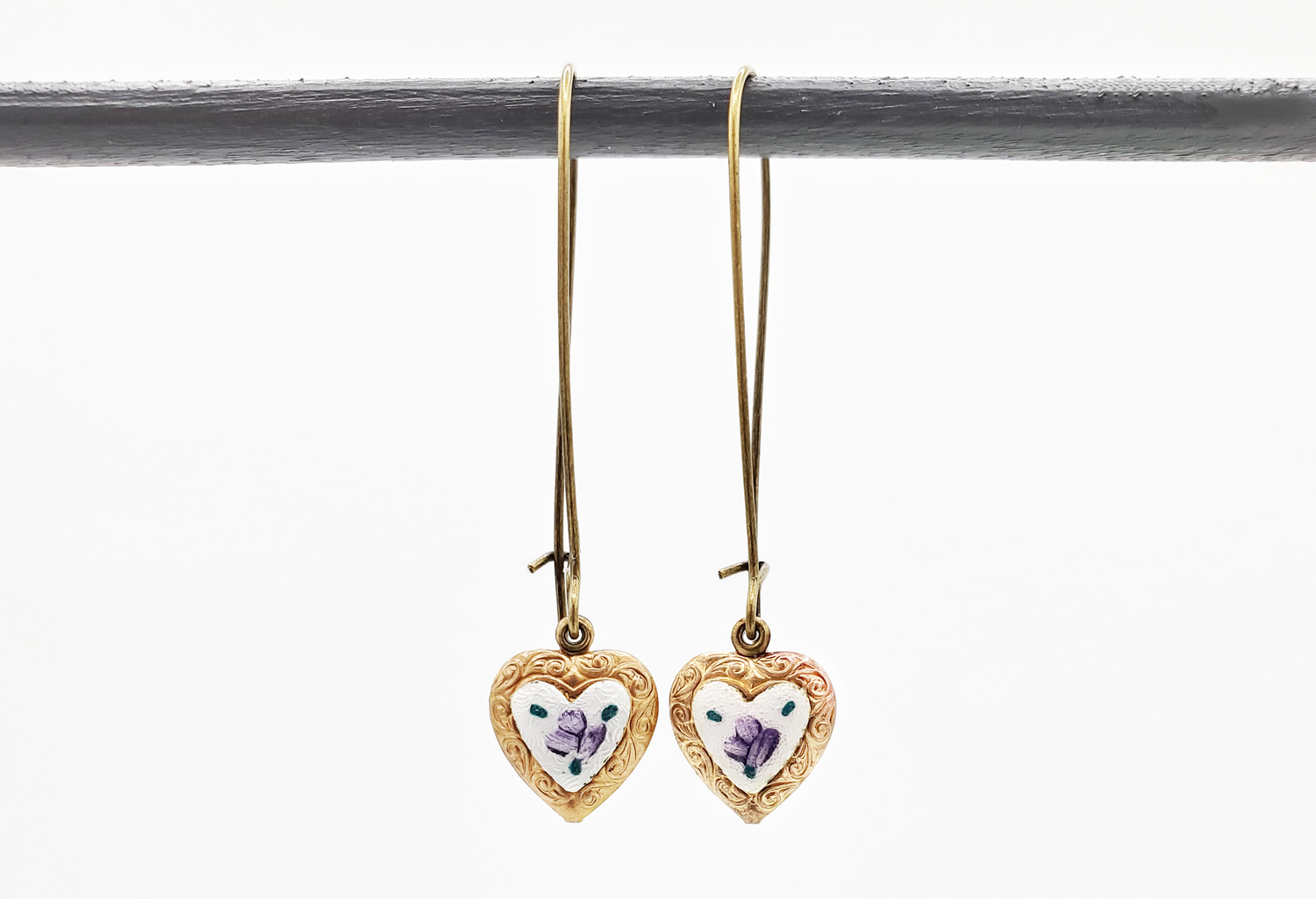 These are my signature heart earrings with purple roses. I used to give them to friends. Then their friends would see them and ask where they got them, so I ended up making more and selling them to the friends of friends.