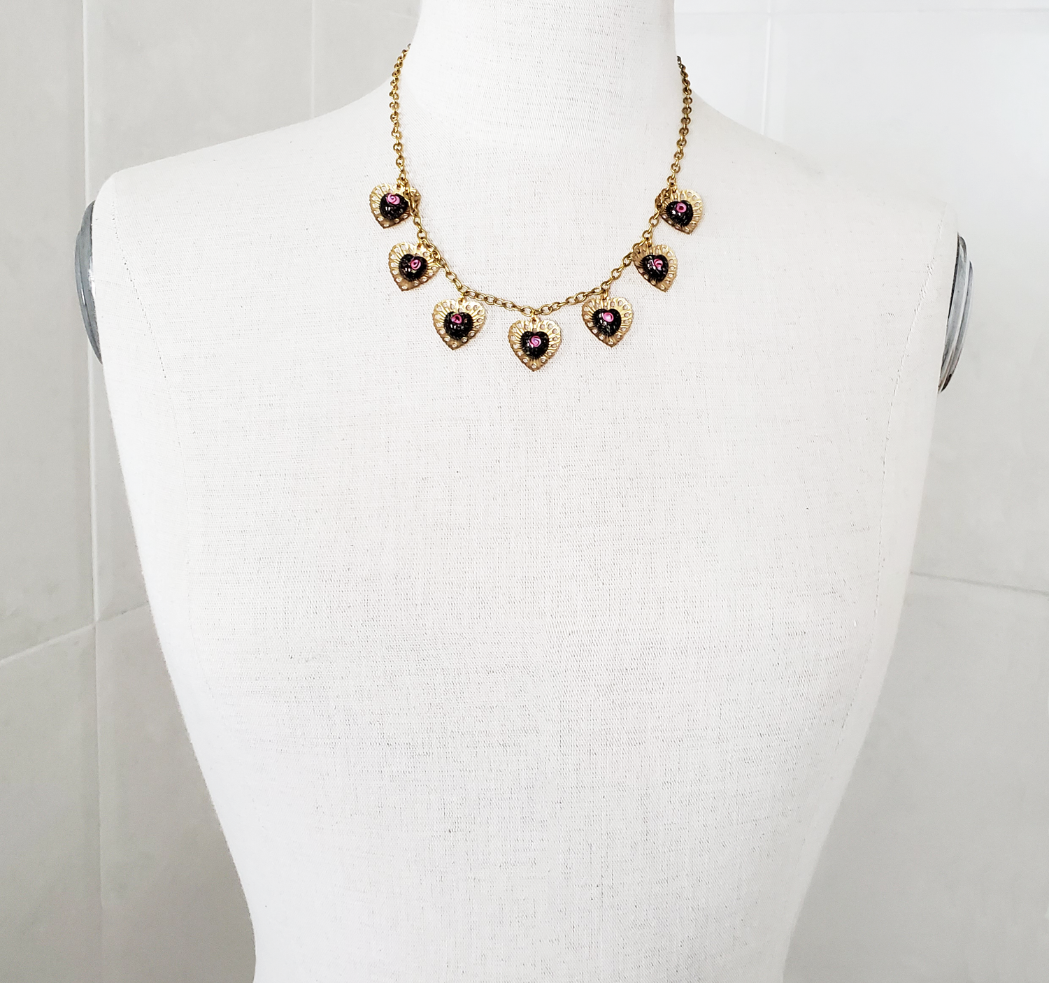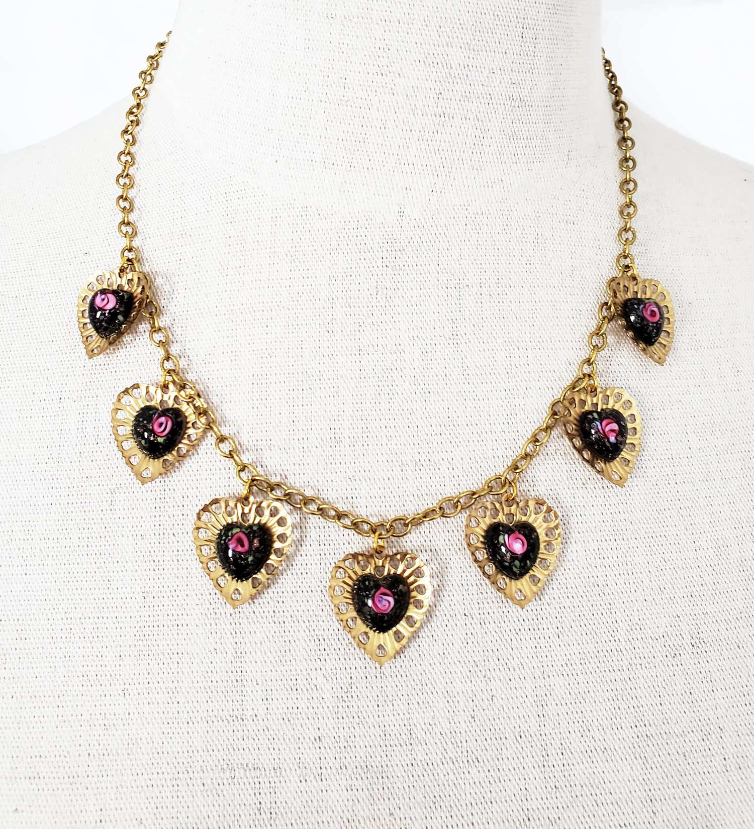 Vivid pink flowers and sprinkles of green and gold pop in these gorgeous vintage lampwork heart cabochons. They are set in kitschy, but classic midcentury pierced heart stampings. Fun, elegant, interesting.