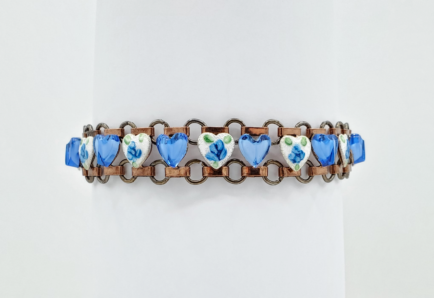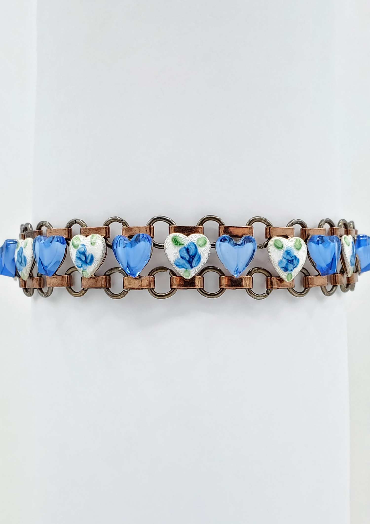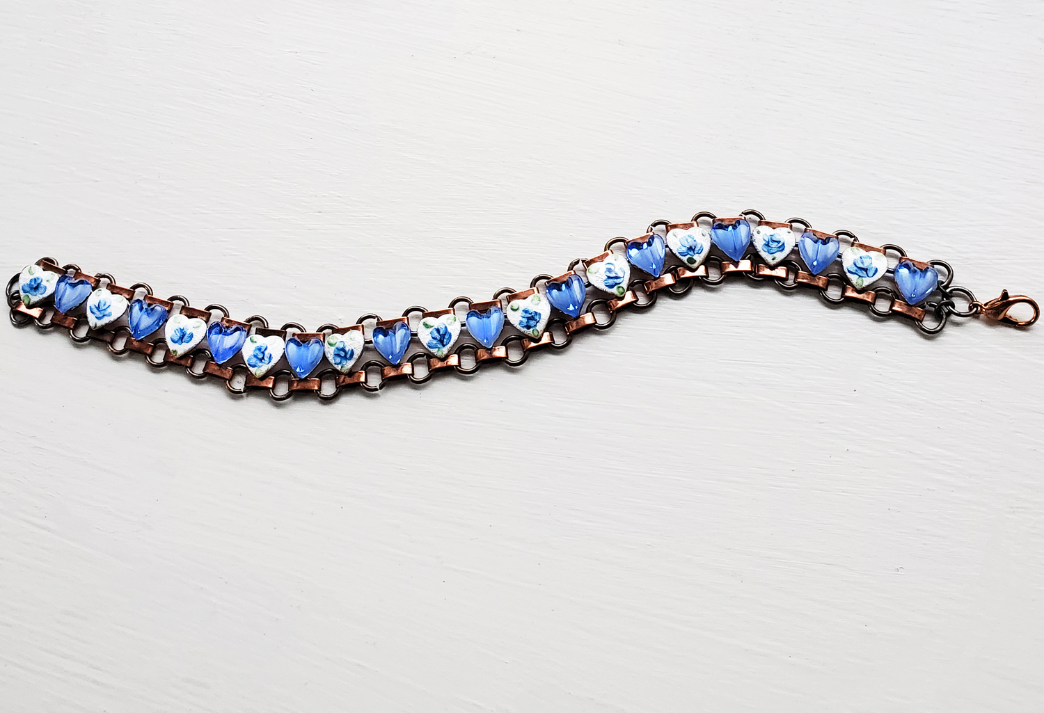 I love these bracelets! Not bragging (much) - because they were inspired by this amazing copper and steel heart chain, and oh, the possibilities. This version has givre blue heart cabochons and these lovely enamel hearts with blue roses.