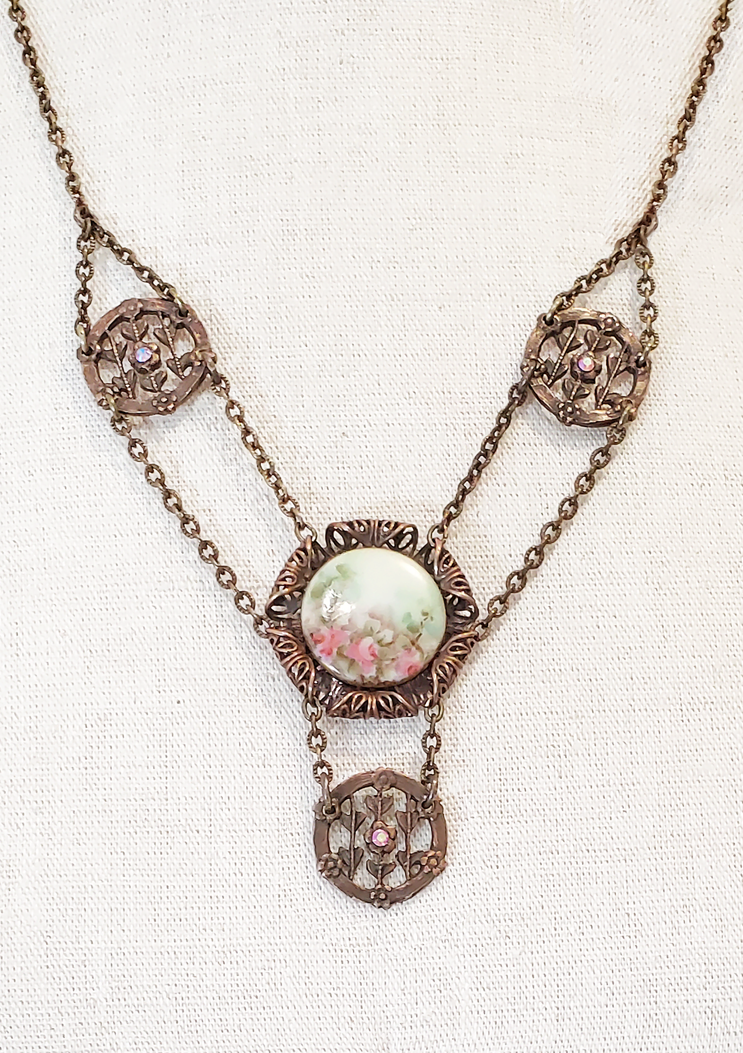 One beautiful antique button set in an a patina brass filigree setting is joined to detailed and old brass settings by a vintage pin stripe chain. Definitely a nod to the past (because if the shoe fits...). Tiny vintage Swarovski AB crystals add punctuation.
