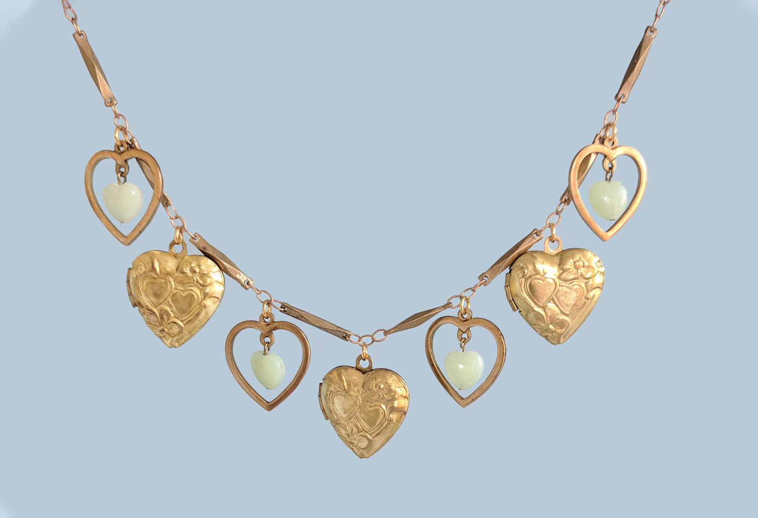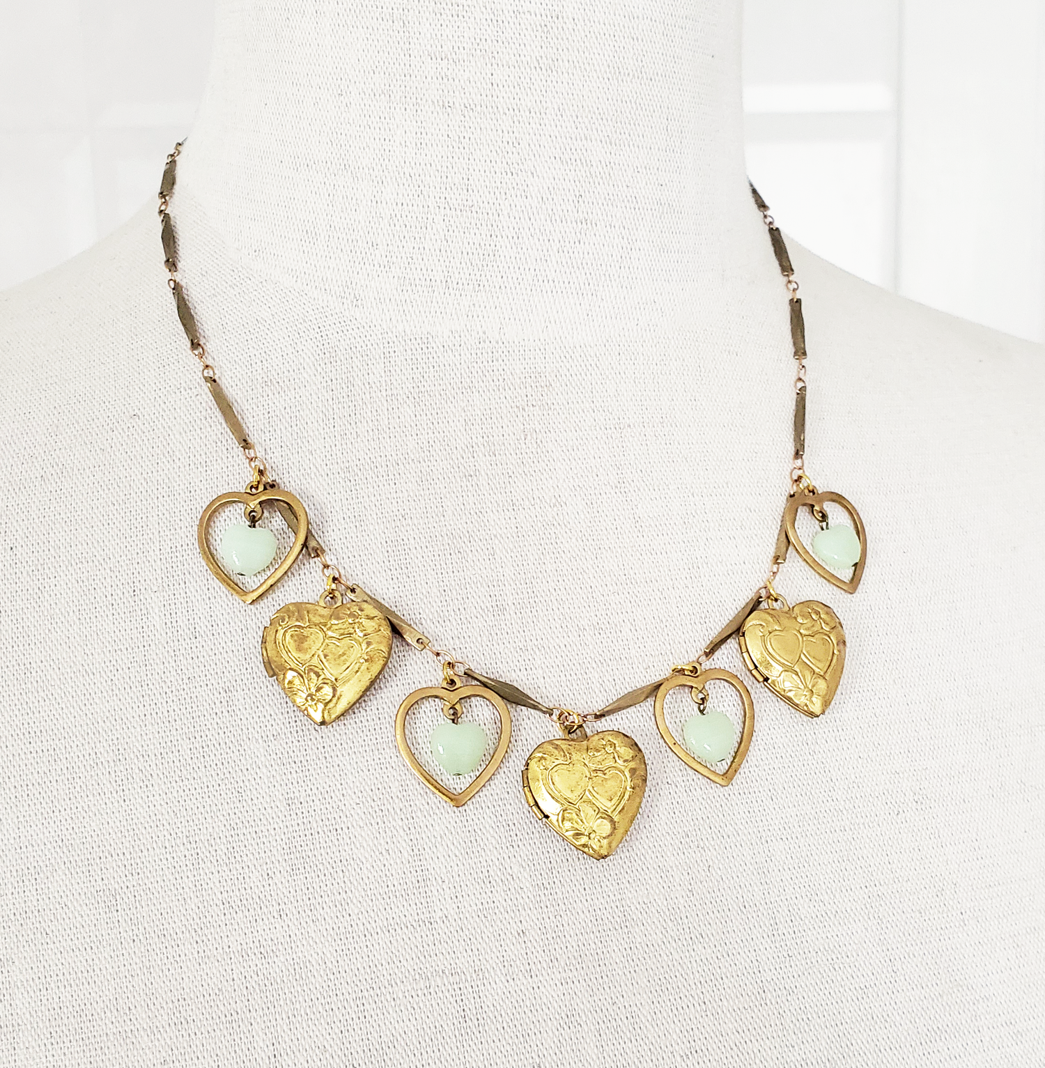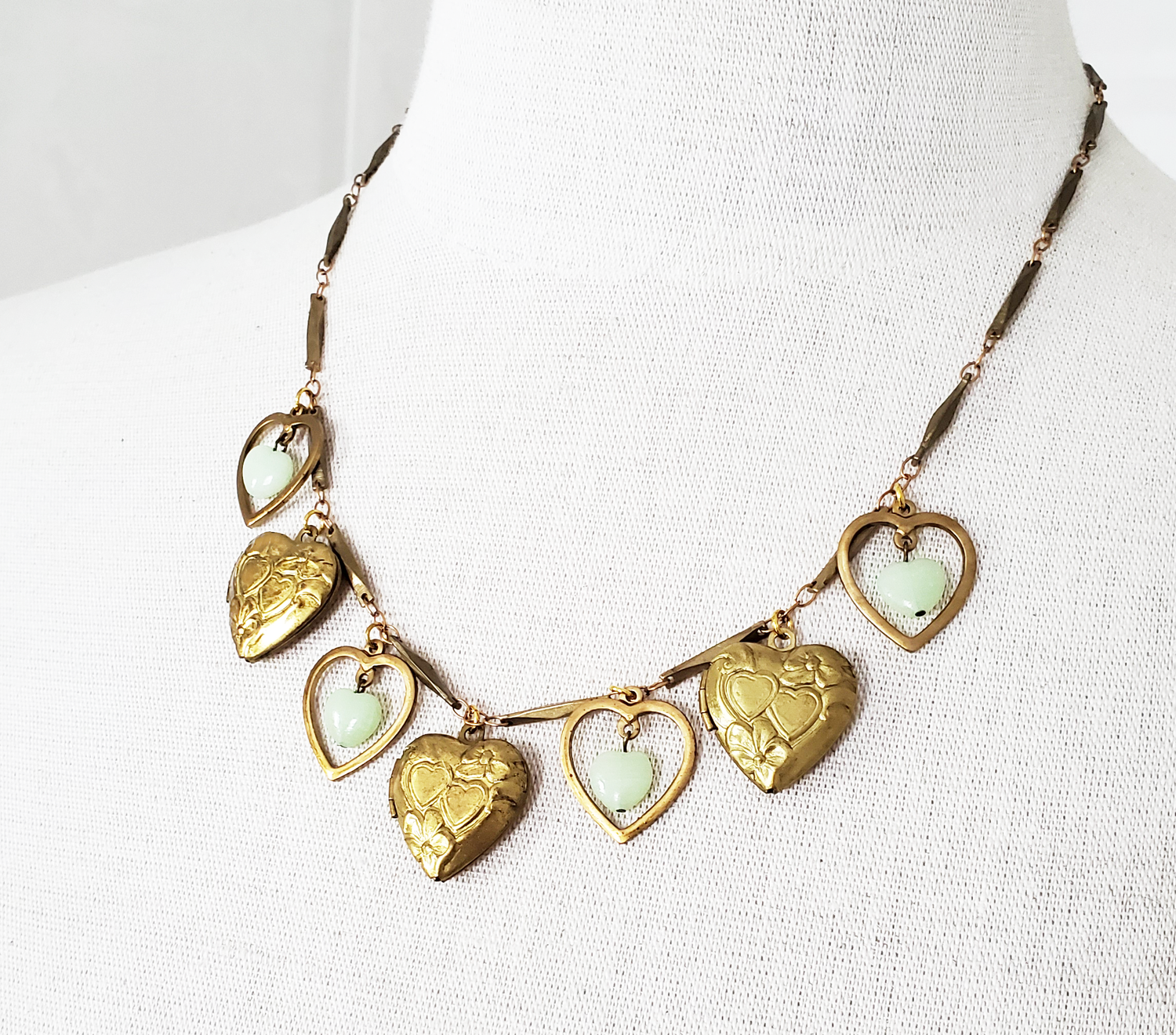 A fun and funky collection necklace with two variations on the heart theme. The vintage heart lockets are weathered and embossed with two hearts (which are better than one!). The frame stampings hold light mint green Czech glass heart beads.