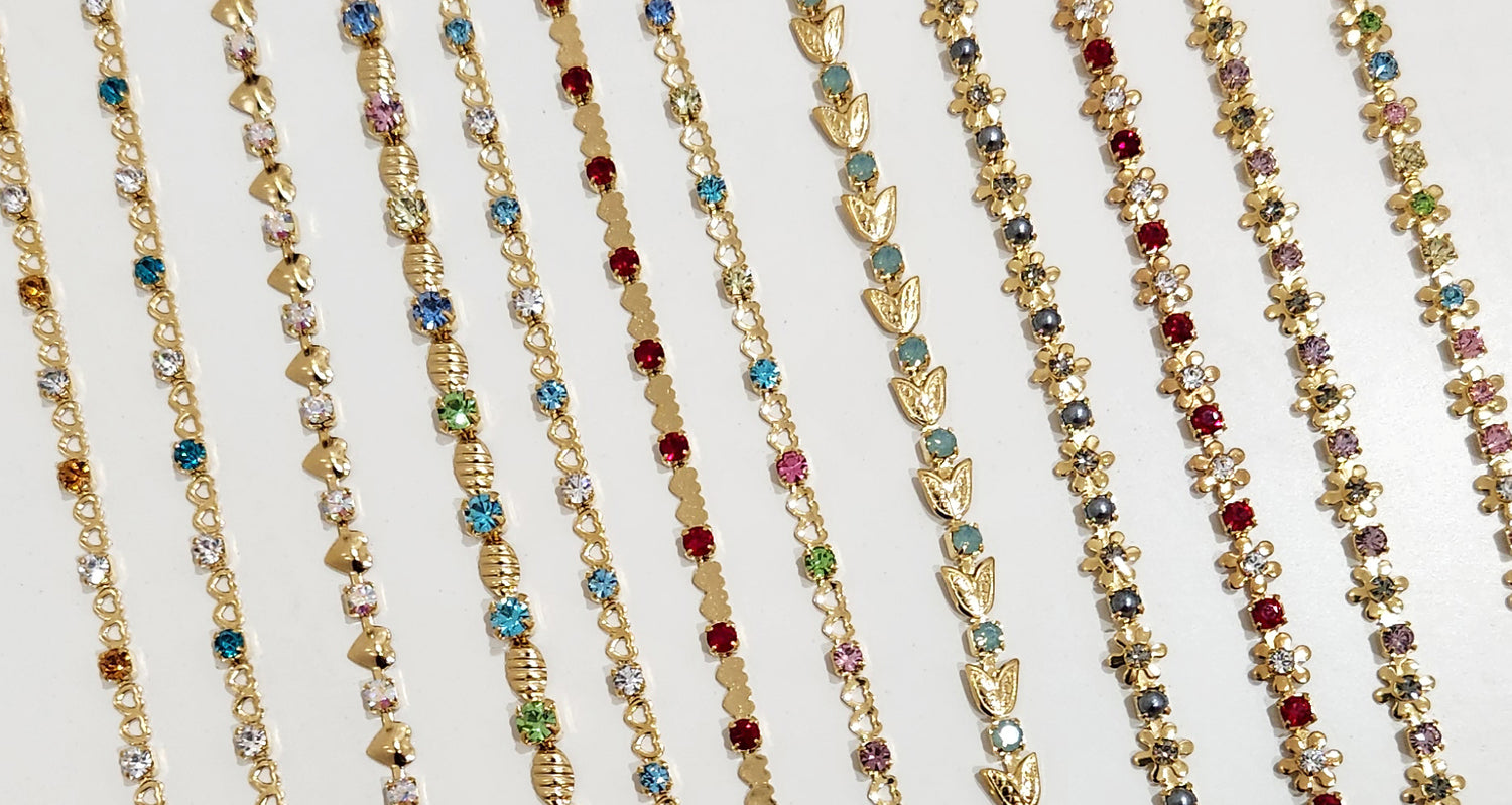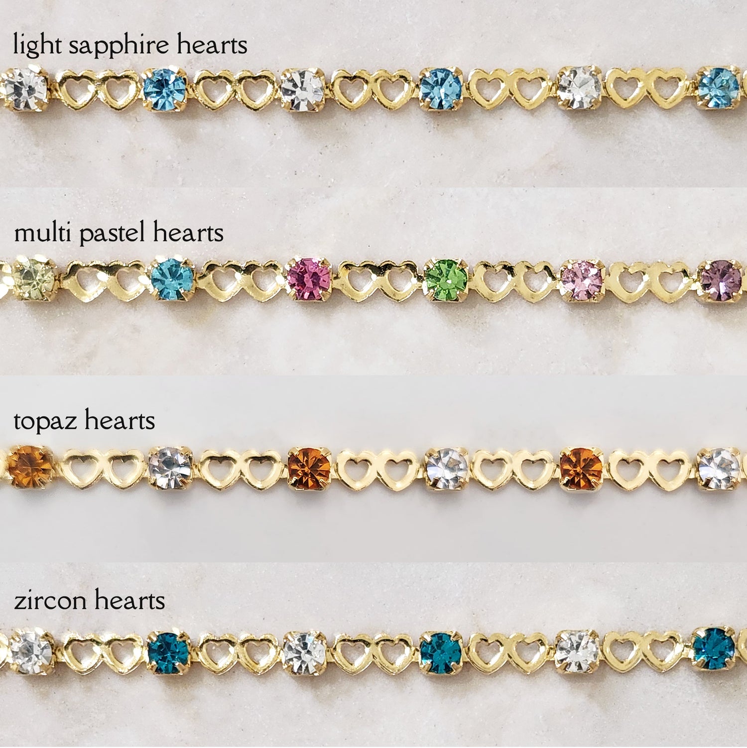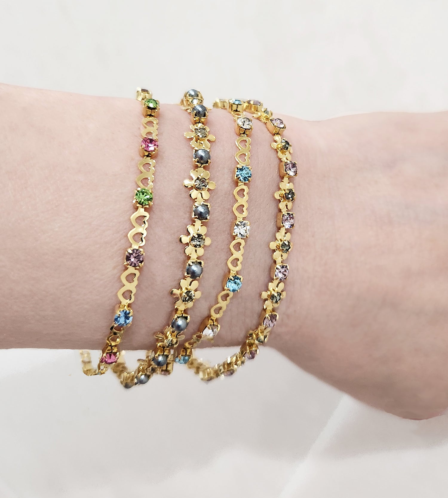 Made from vintage Swarovski crystal cup chain, these bracelets are beautiful, whimsical, and elegant, all at the same time. You don't need to stack them - they make an impression all by themselves - but it sure is fun. They are gold plated brass with a spring clasp, and are best worn close to the wrist. The standard size is 6 1/2 inches, and they can be reduced or extended at your request - just add a note at checkout.