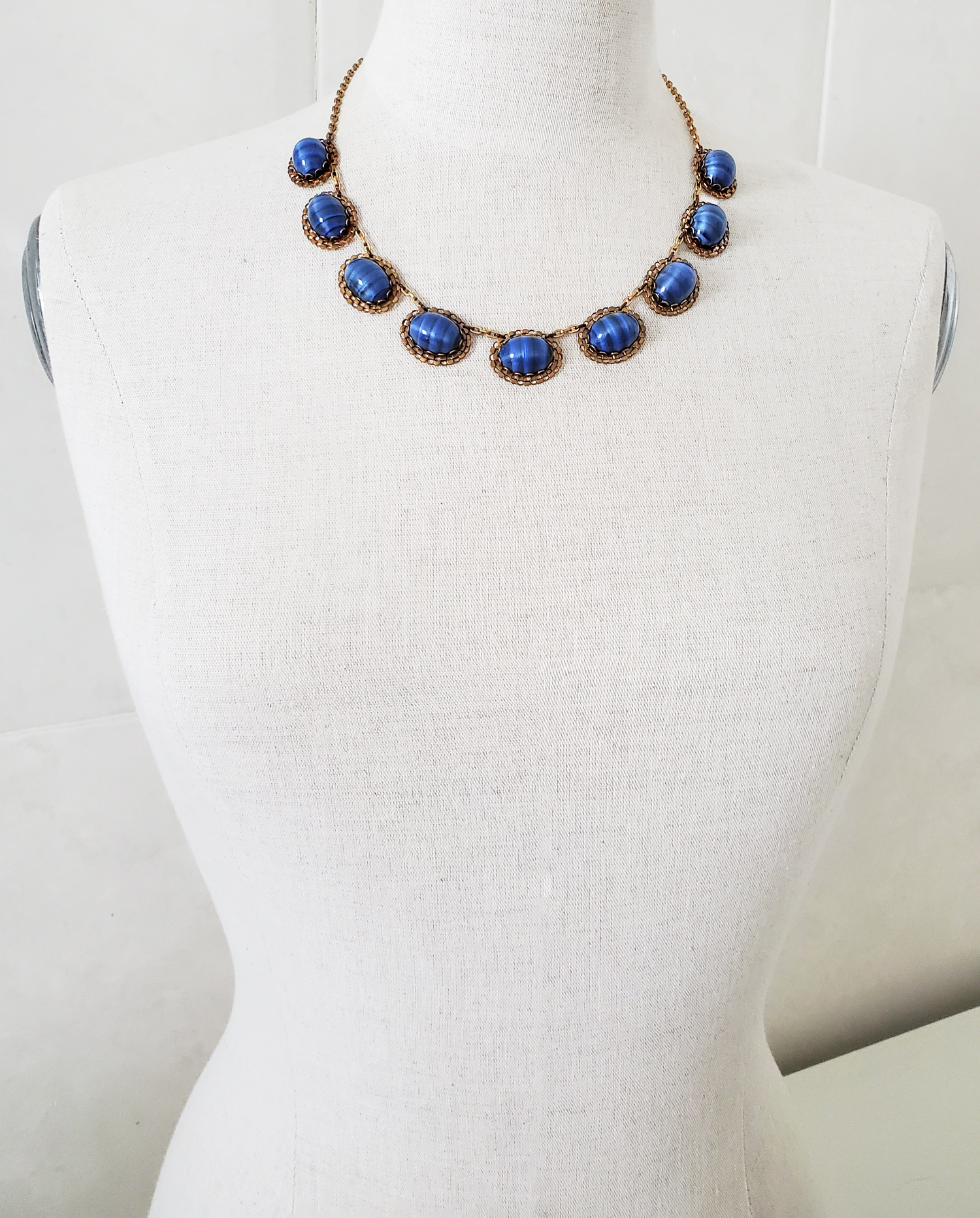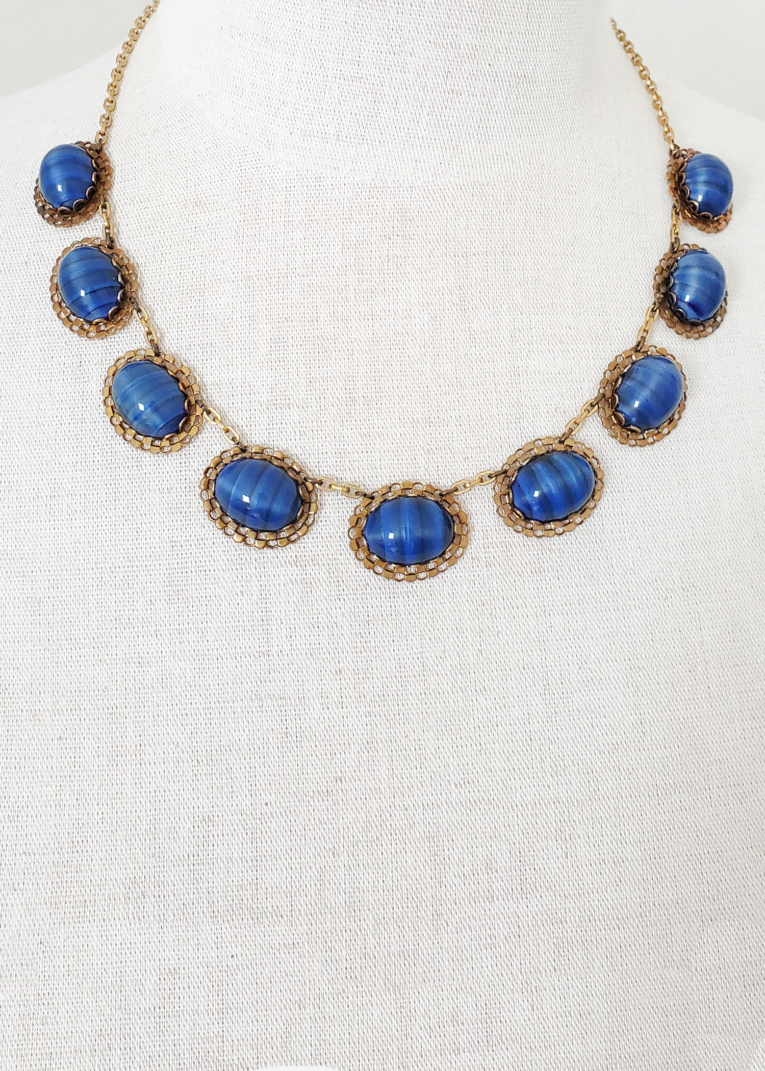 These vintage Czech glass tiger eye cabochons have amazing color and dimensionality under a highly polished surface. They are set in vintage geometric oxidized brass stampings.