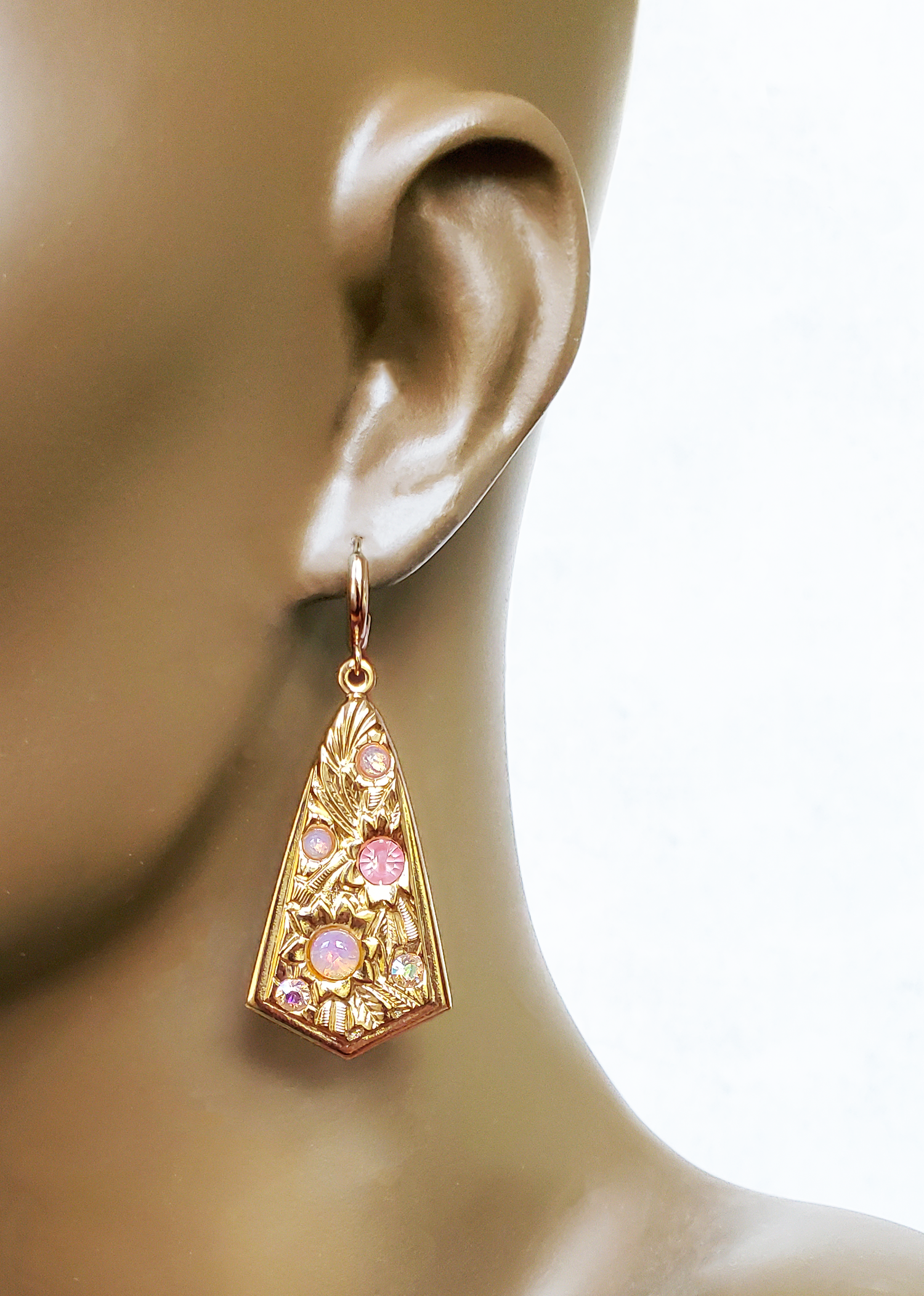 Definite Statement earrings. Had these highly detailed stampings gold-plated. Not weathered antique gold. Just gold. To maintain a dignified amount of subtlety, they are set with pink glass fire opals, AB crystals, and a givre rhinestone for good luck.