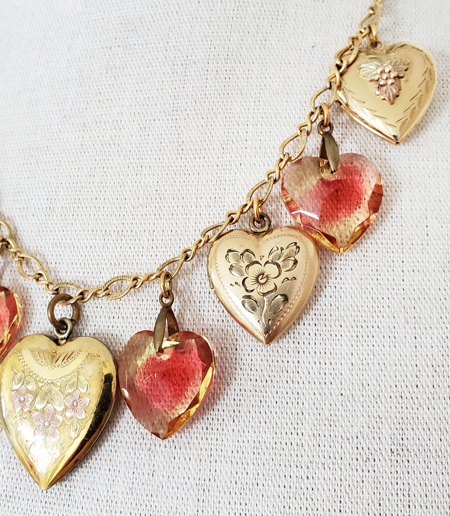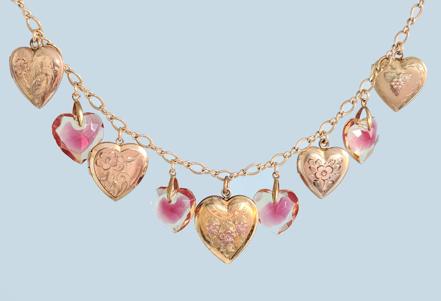 A collection necklace of gold-filled heart lockets of various ages and designs. They are interspersed with Sabrina glass heart pendants in Jonquil and Rose to set off the details of each lovely locket.