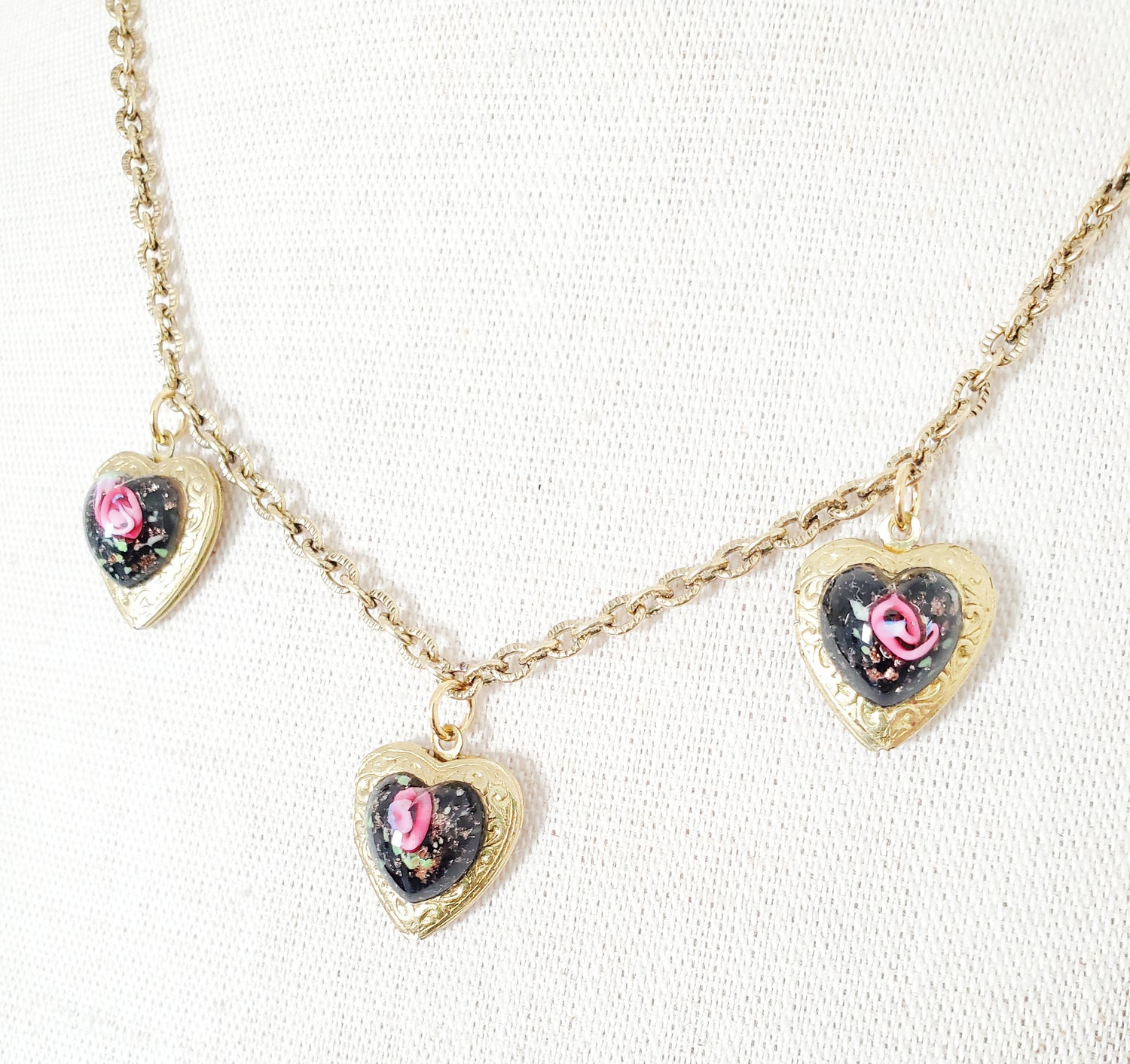 Vintage Brass Heart Lockets are crowned with stunning vintage lampwork glass cabochons...It's a homerun and a trifecta!