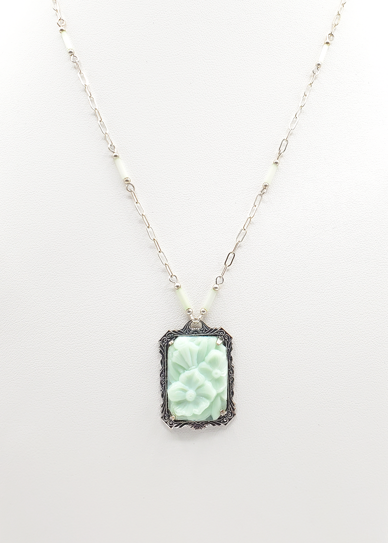 This is an amazing old Gablonz cabochon, in the best tradition of Bohemian glass. It is set in a vintage, antique silver plated pendant setting that shows it off perfectly, not to mention the touch of celadon in the beaded chain. Serenity.