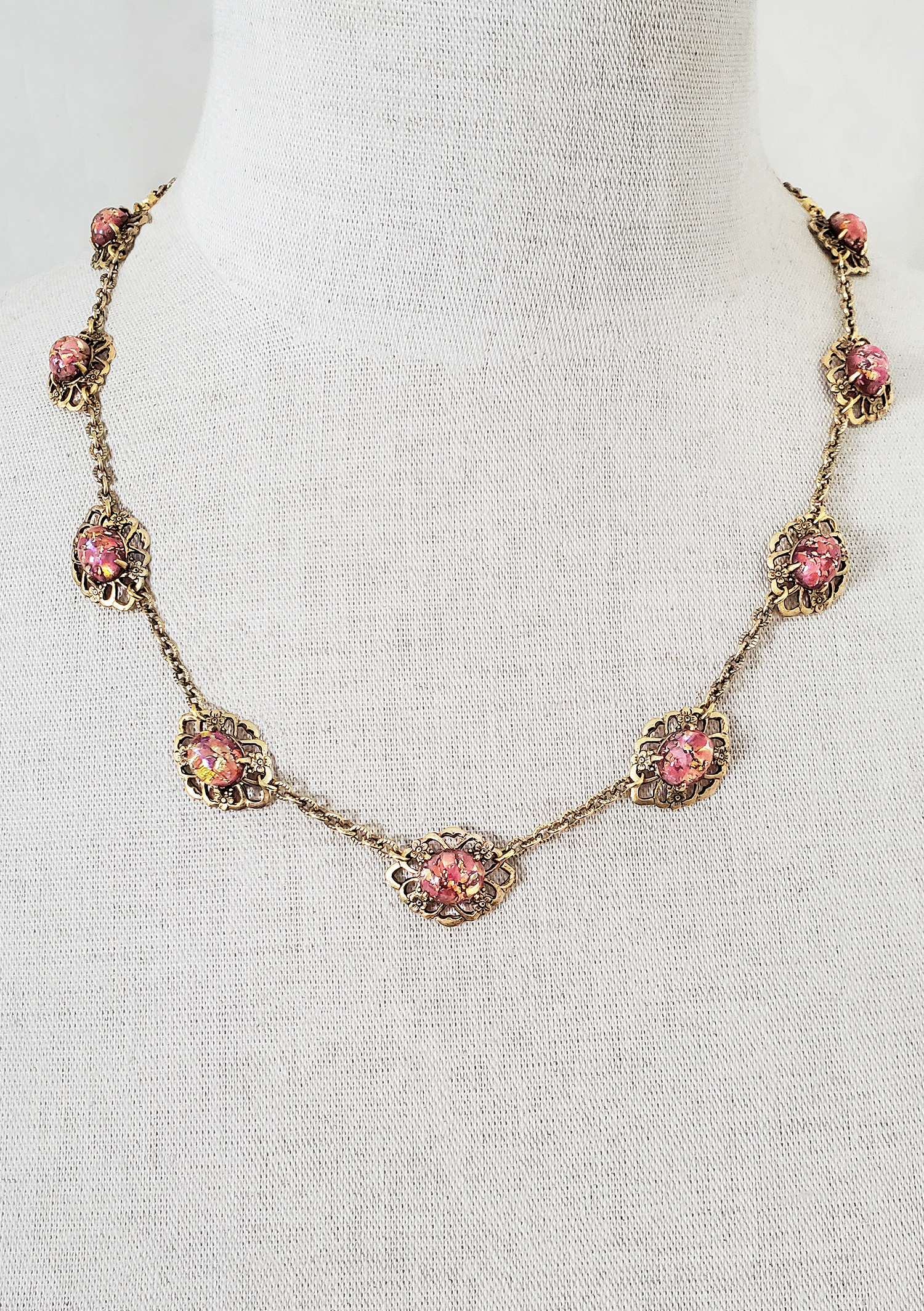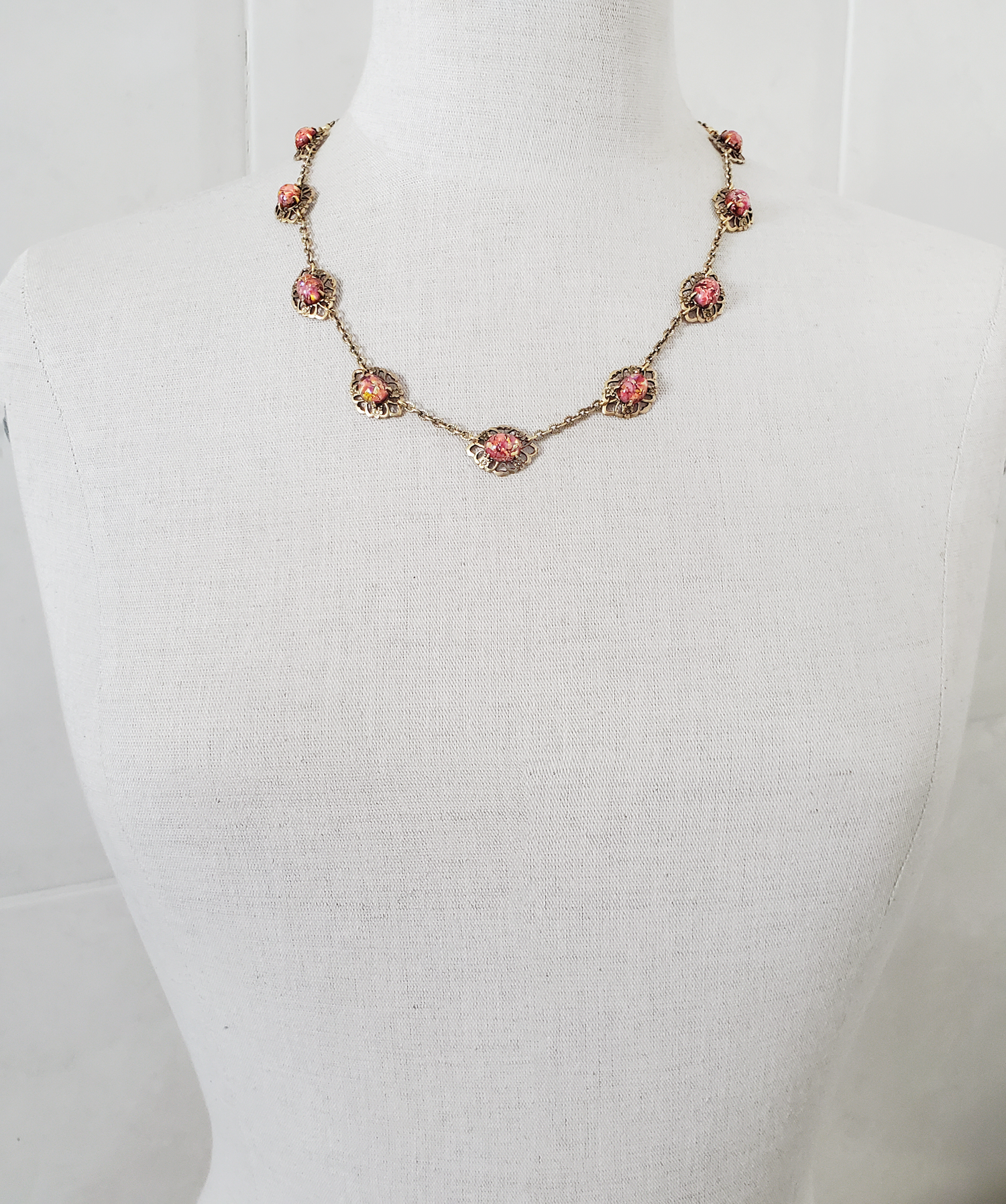 This will let some sunshine in. Sweet, hot, Czech glass cabochons are set in highly detailed settings that were made in vintage machine tools that have been used continuously for over 100 years. The settings and vintage chain are plated in antique gold.