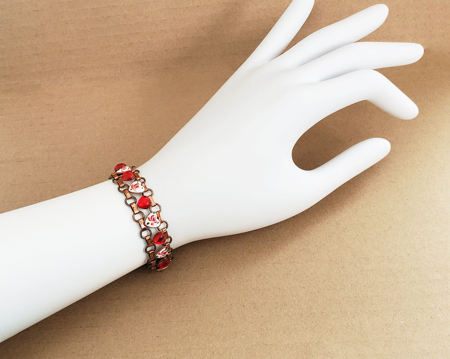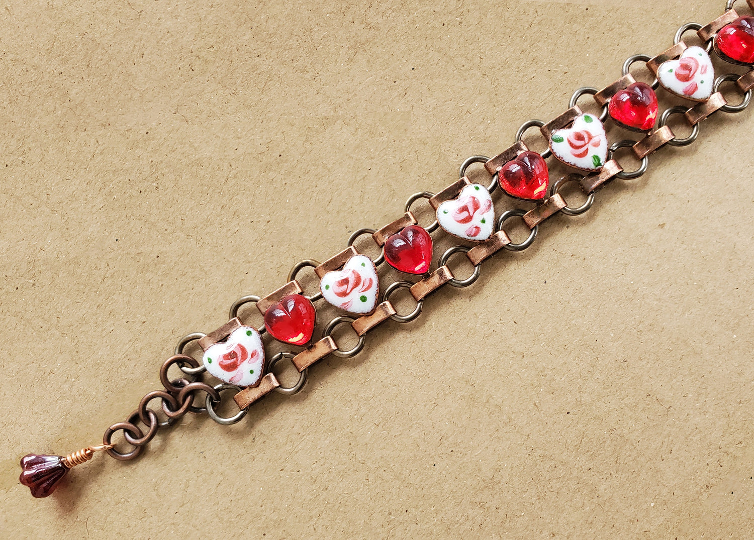 I love these bracelets! Not bragging (much!) - because they were inspired by this amazing copper and steel heart chain, and oh, the possibilities. This version has Siam Red heart cabochons and these lovely enamel hearts with dark pink/red roses.