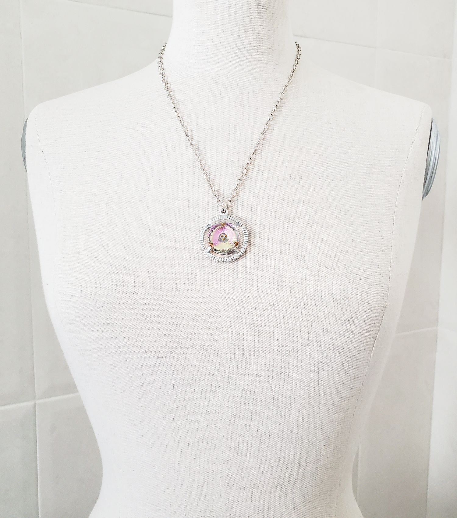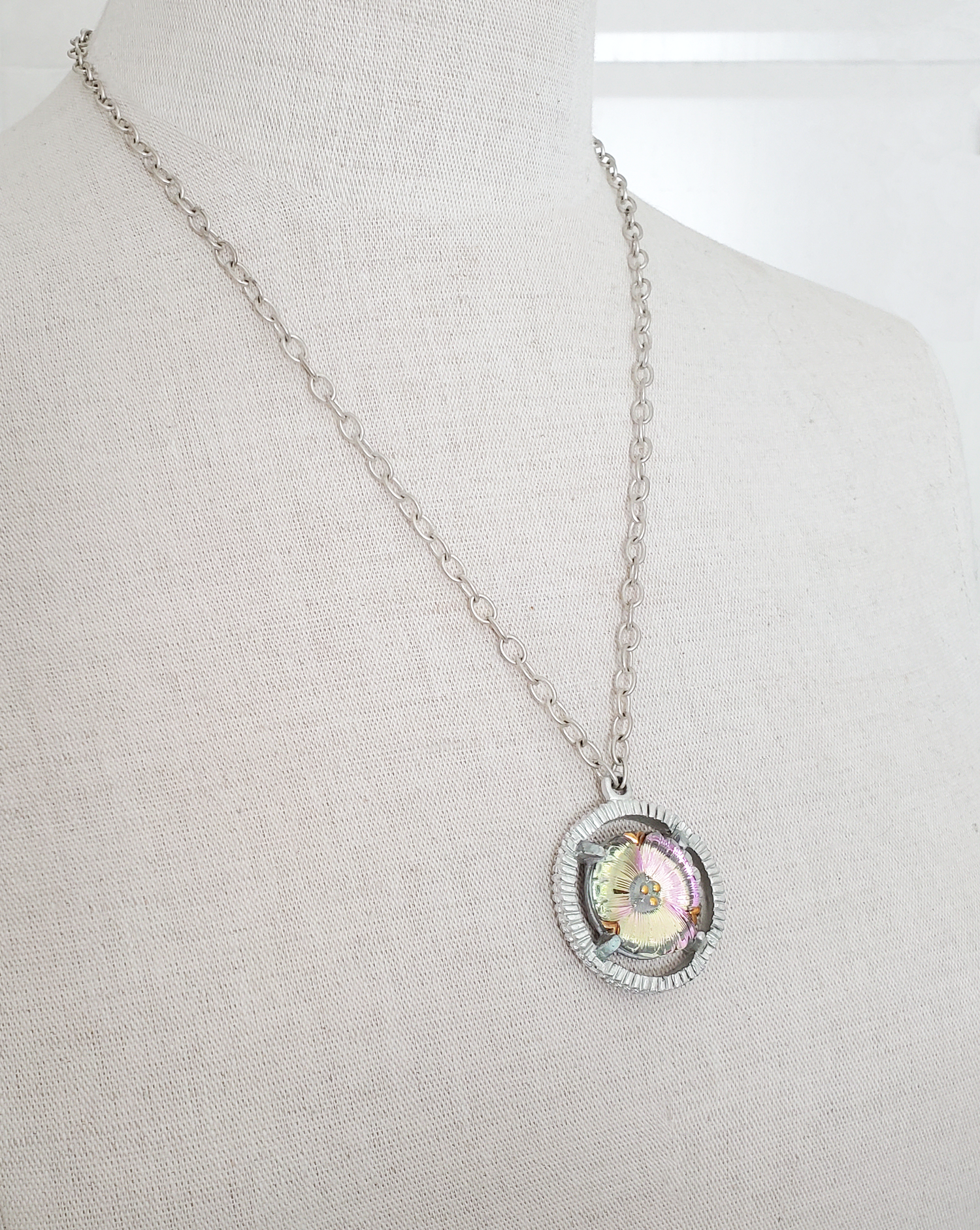 It is set in a vintage, but modern, "floating" pendant base that was meant to hold a coin, or maybe...a beautiful button.