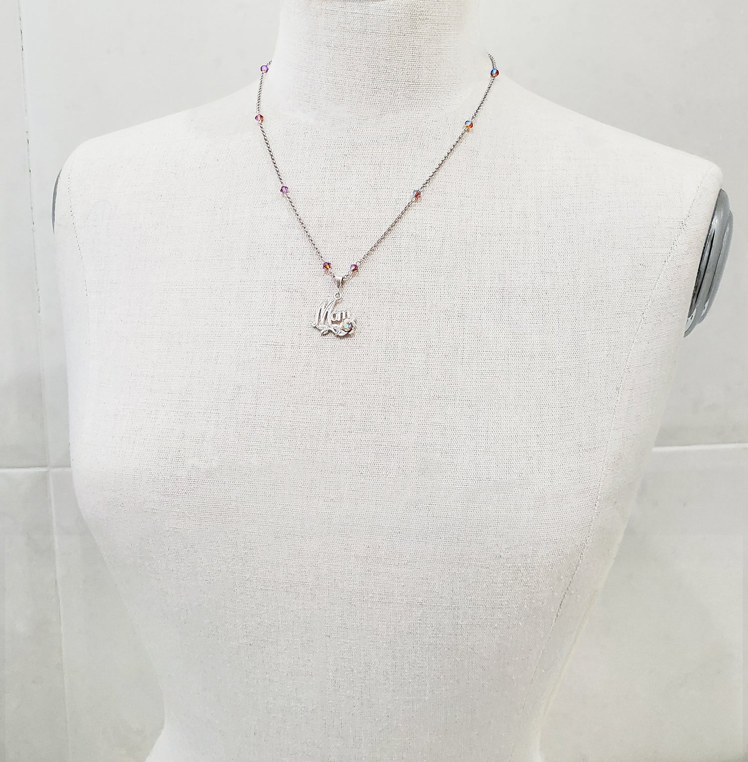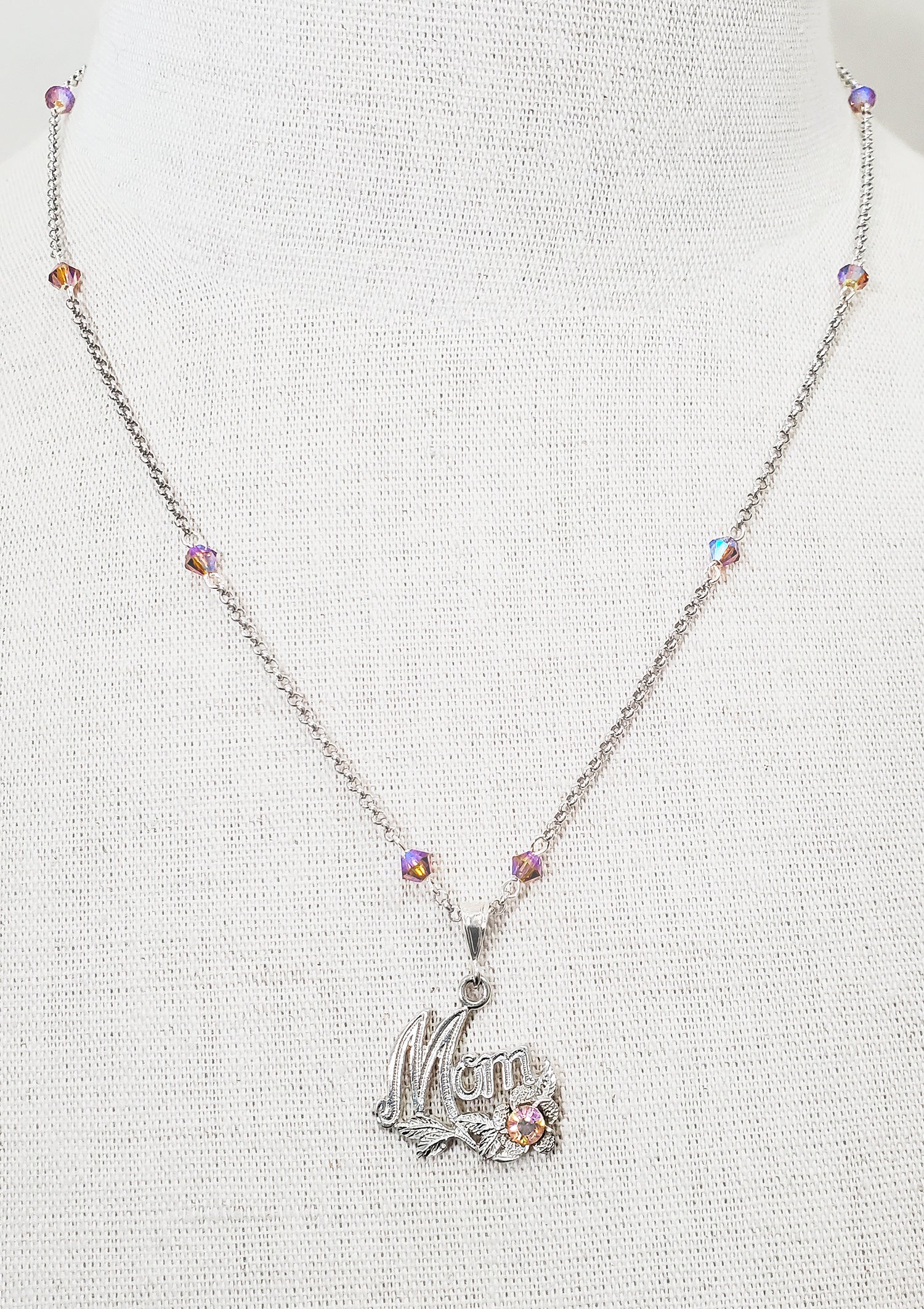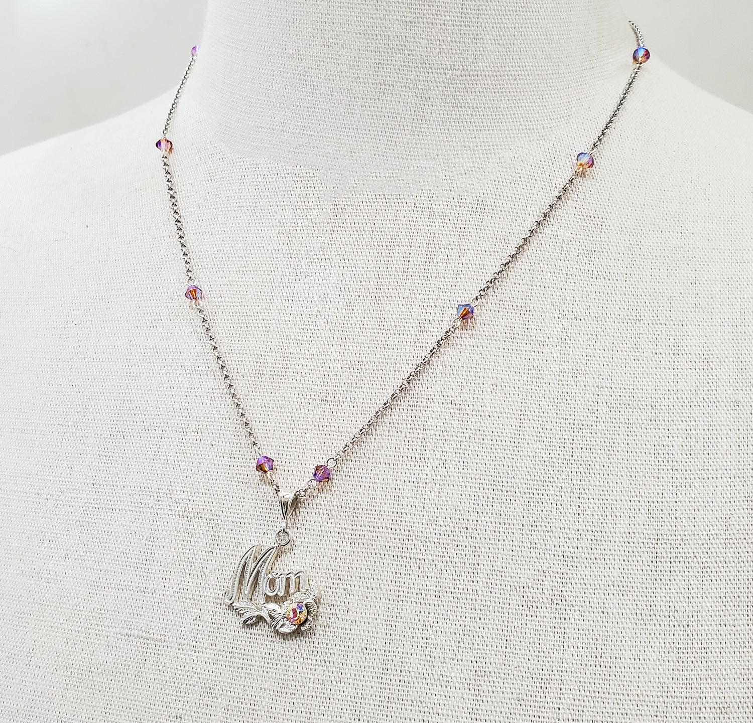Cool, fun, and funky vintage "Mom" pendant adorned with Swarovski Aurora Borealis crystals.
