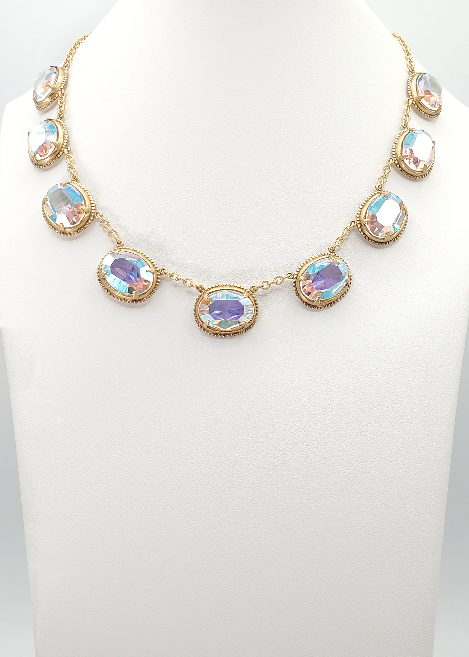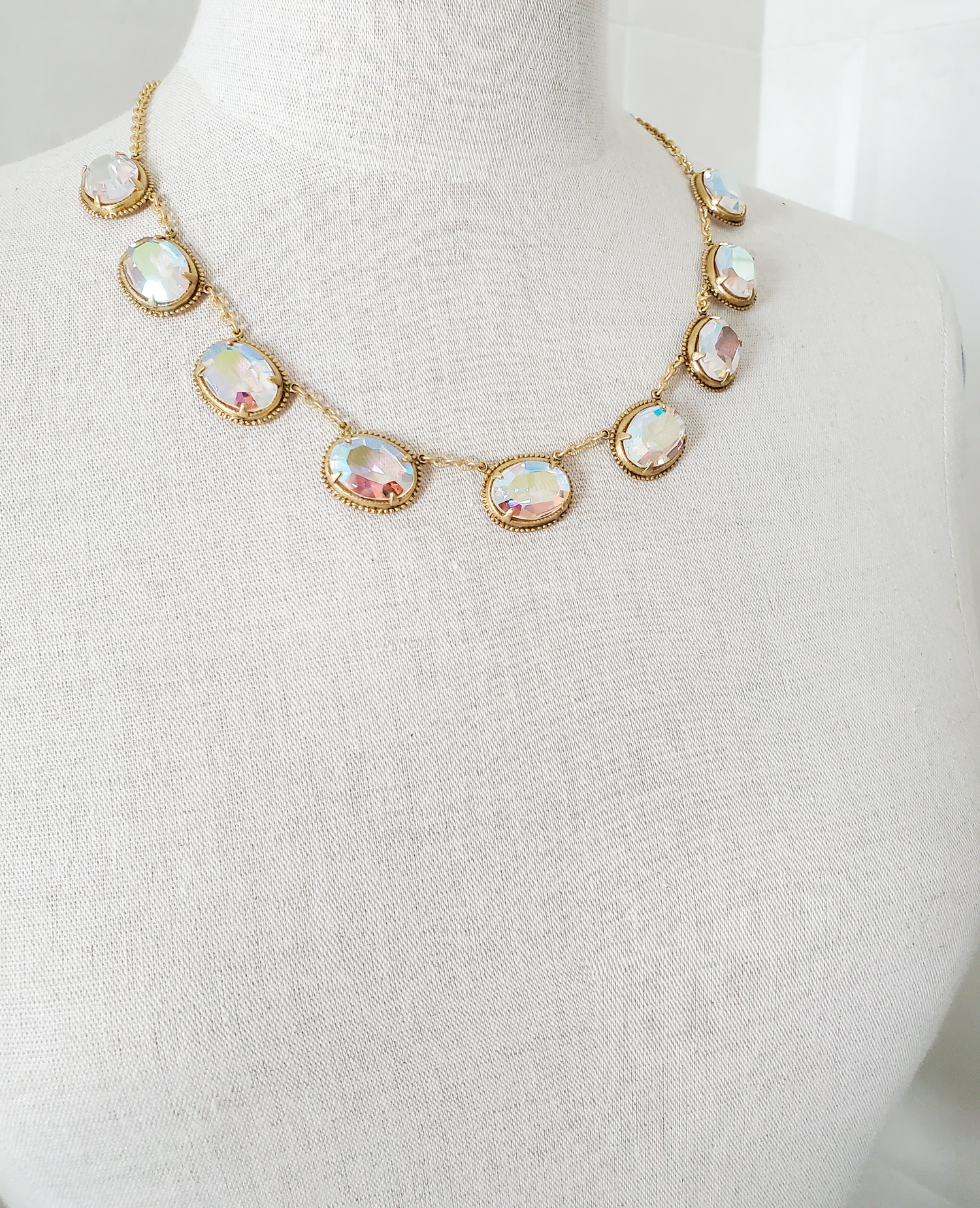 This Aurora Borealis crystal is different from others. It has peach, amber, and sometimes purple. It is softer, without the harsh here-I-am angles screaming for attention. I sure wish I could make another necklace like this. This is the only one.