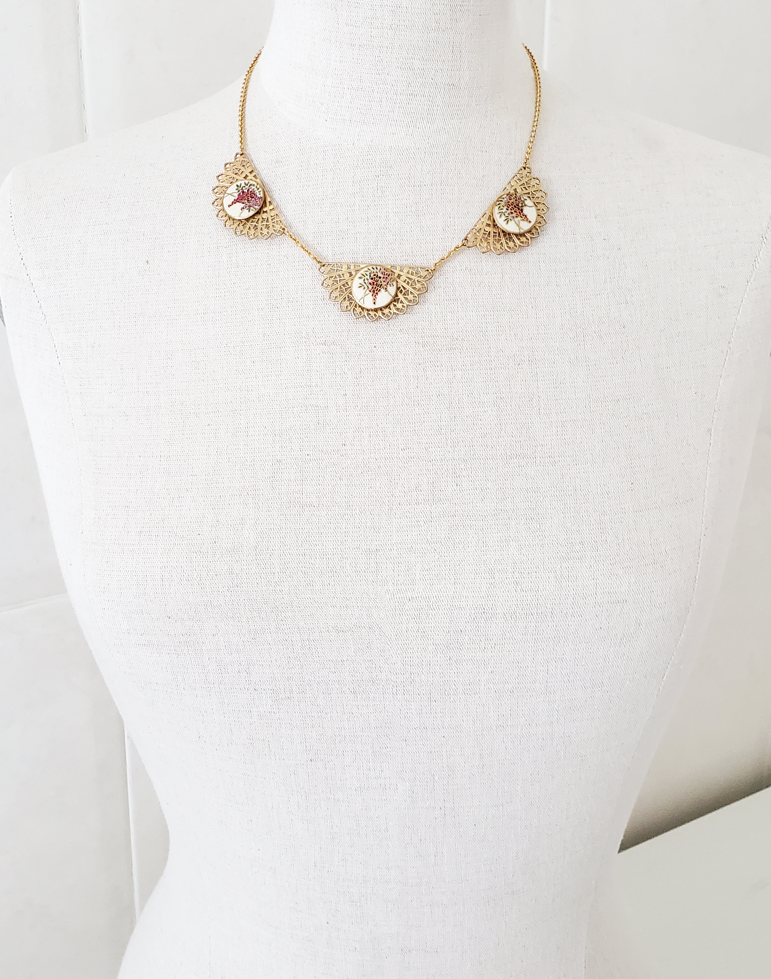 The buttons in this necklace have a classic wisteria design. They are set in filigree brass stampings that have been polished and sealed. This necklace has an extender chain for adjustment up to 2 inches beyond the length shown in the picture.